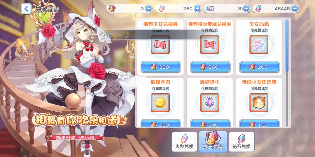 活动的任务是完成翻牌连连看和日常任务来获得火种。使用火种在兑换商店中兑换可以获得燧石,使用燧石在燧石商店中可以兑换重要道具“稀有少女兑换券”(红票)。红票等到种族主Cup后可以点击使用来兑换主C,现在先存着不要使用。燧石还有剩余,建议买比较稀缺的少女心愿。