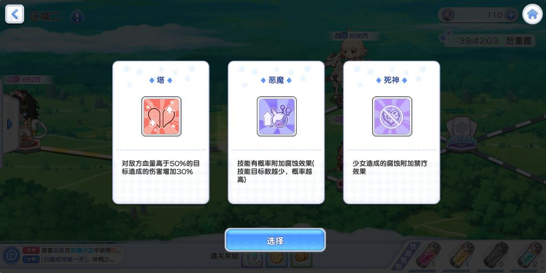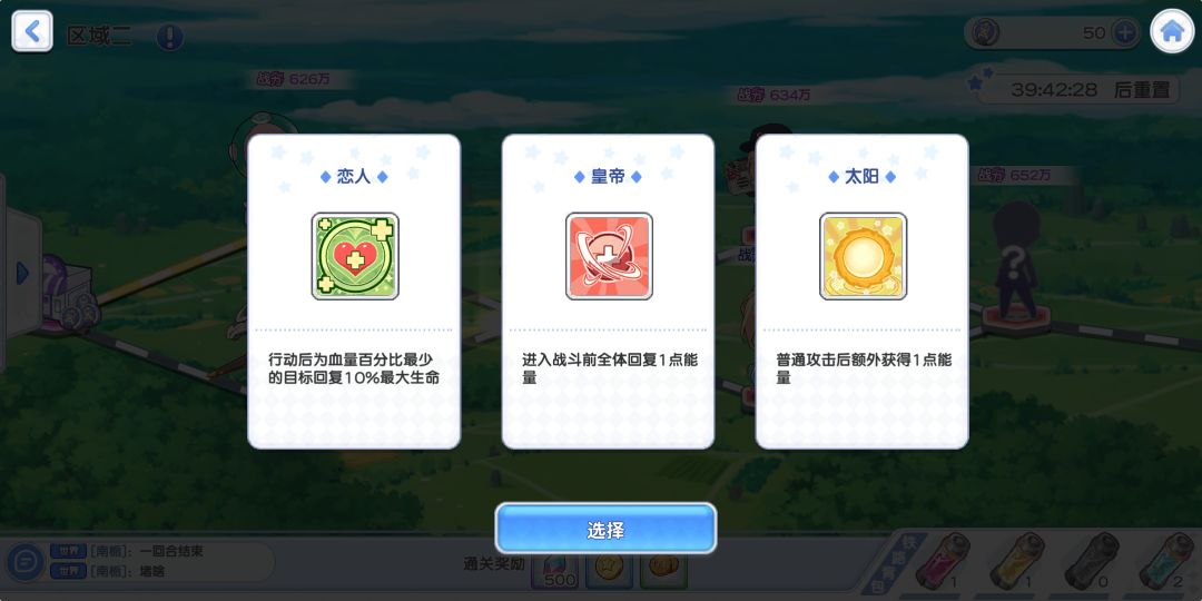 例2:选减伤。虽然有输出暴击,但是为了队伍的稳定性,减伤20%是非常强大的buff