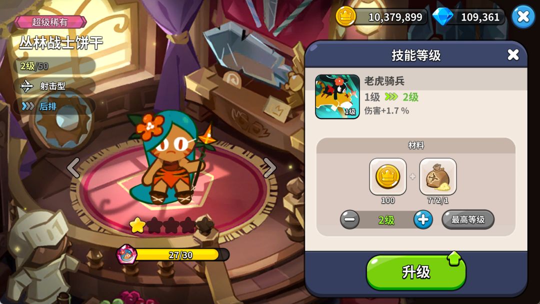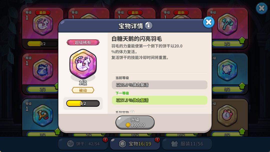 宝物和饼干一样都是可以提升等级,等级提升后宝物对应的属性也会得到加成。前期宝物等级的提升是针对队伍全体饼干的,宝物等级的提升远远大于单个饼干星级的提升。宝物等级提升后对队伍战斗的属性有着极大的加成。