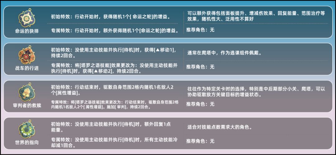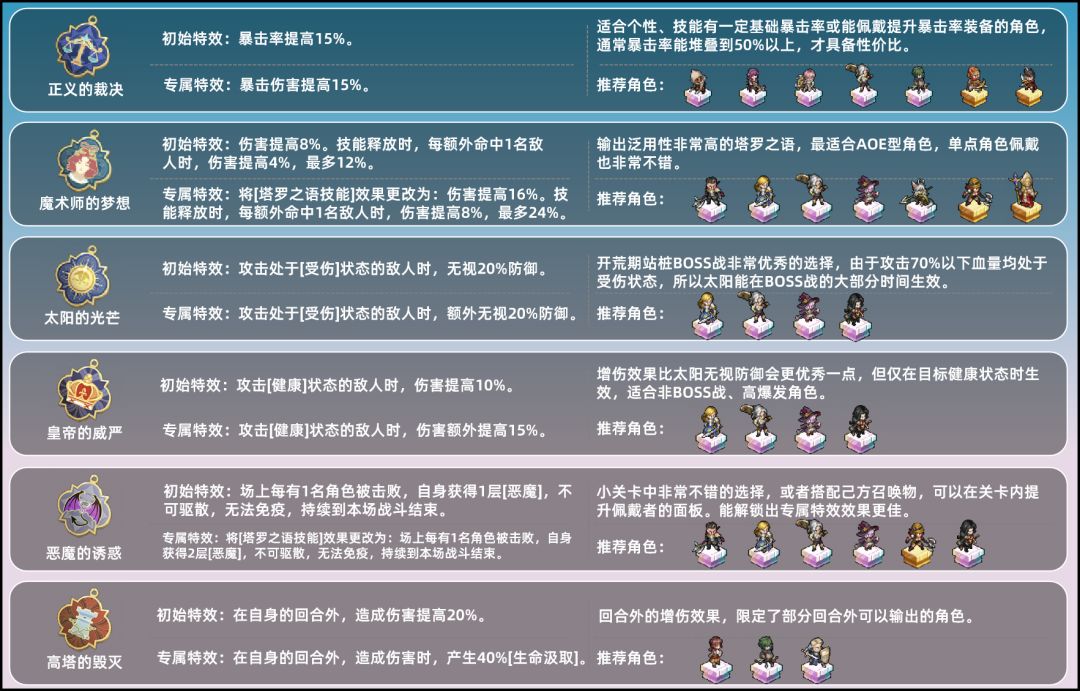 上述4类塔罗之语中,输出类需求偏大,治疗类基本也就绑定了2-3位角色;生存类除了特定角色之外,开荒阶段隐者的寂静泛用性也不错;功能塔罗需求量整体就偏小了。