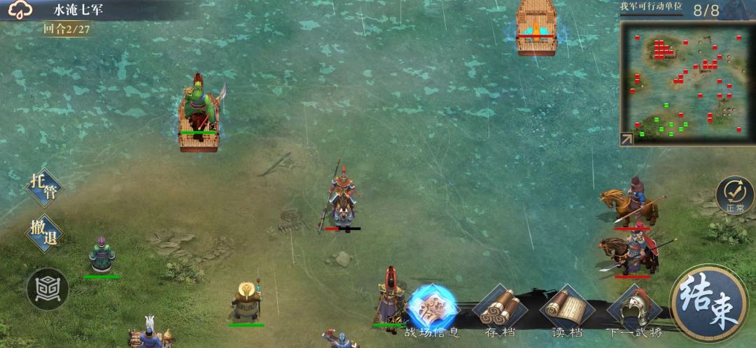 马良给吕布加速,吕布普通攻击秒右上水灵,(水灵物理格挡100%,但是用铁矛普通攻击可以破,需要SL)然后回归往下面赶,5回合内赶到大招灭最后一个水灵通关。(5回合内没有全灭水灵会复活)