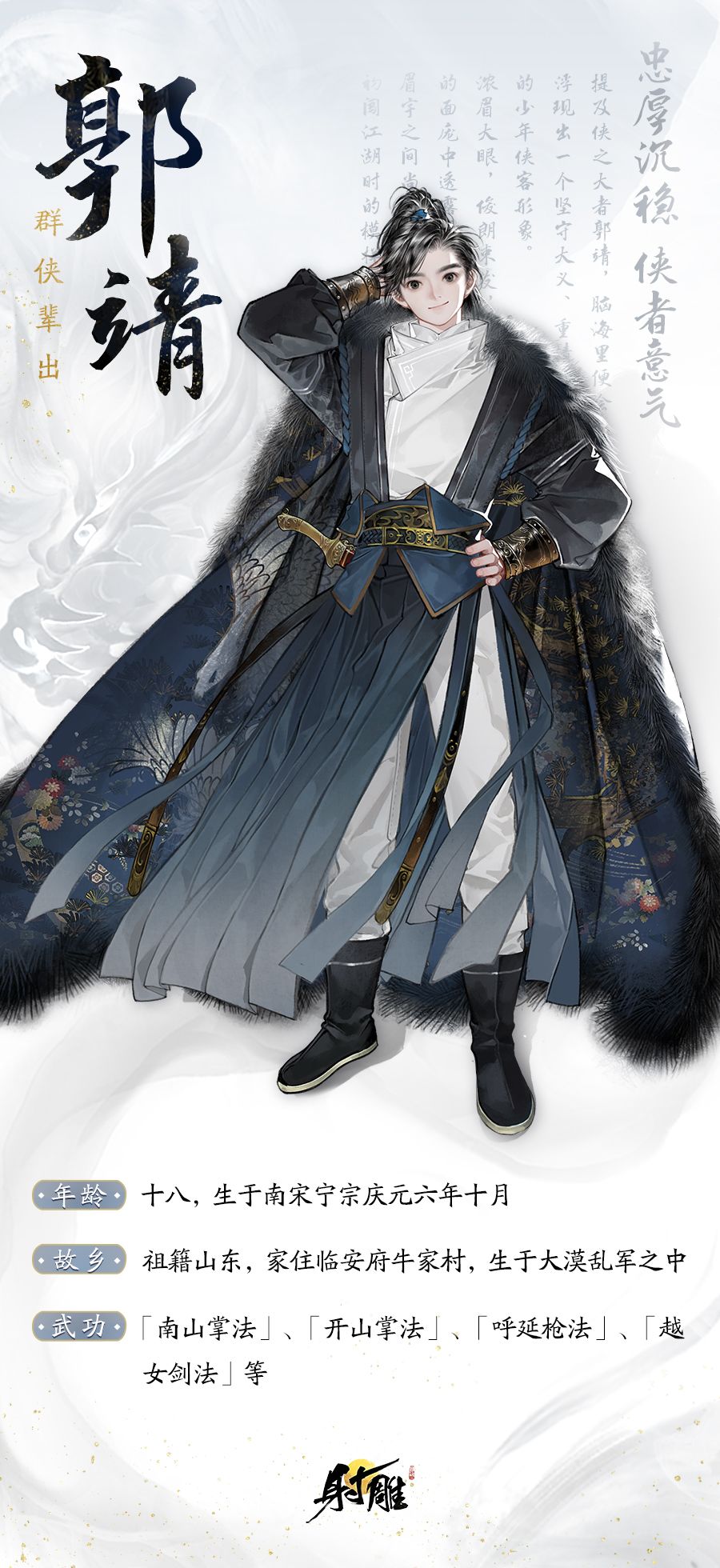 设计”郭靖“这个角色的时候,我们融入了自己对于江湖里“侠”的理解,与他朝夕相处,倾听发生在他身上的故事。也希望在《射雕》江湖中他能获得大家的青睐,陪伴天下英雄豪杰,鲜衣怒马,仗剑天涯!