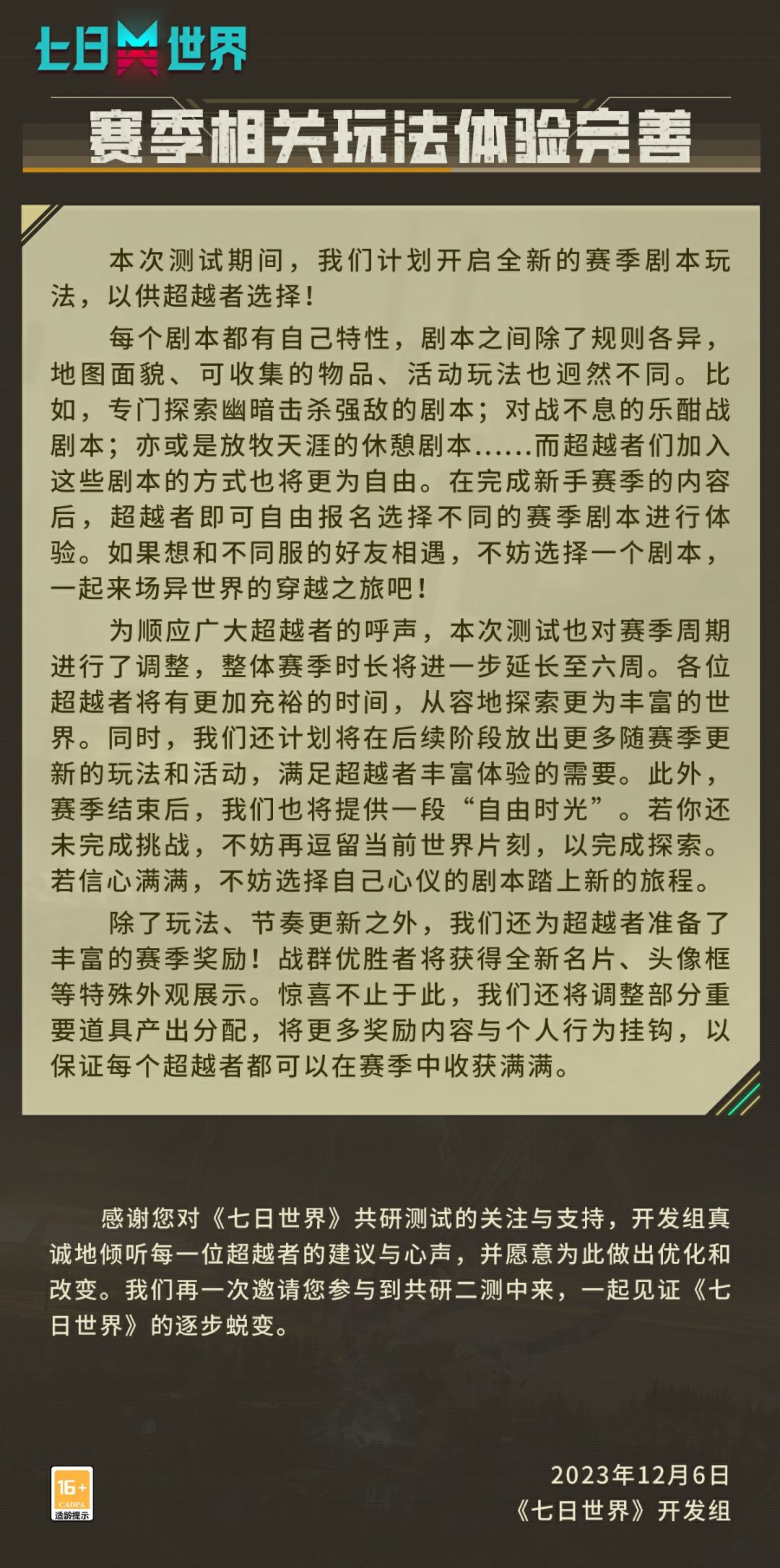 感谢您对《七日世界》共研测试的参与和支持,共研二测将于 12月7日 15:00 正式开启!