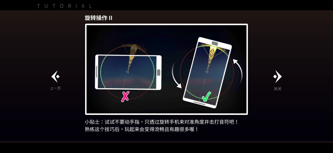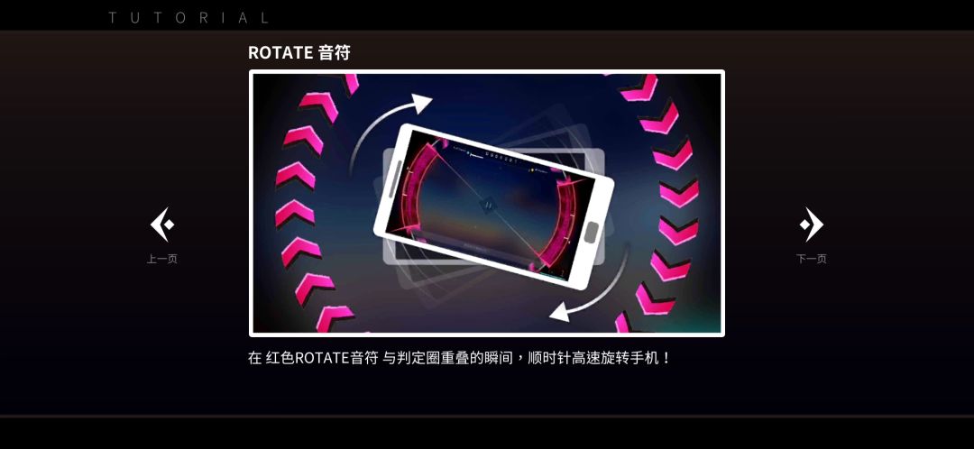 而游戏里的精髓,就是「ROTATE音符」,你需要在它与判定圈重叠的瞬间,顺时针或者逆时针高速旋转手机。