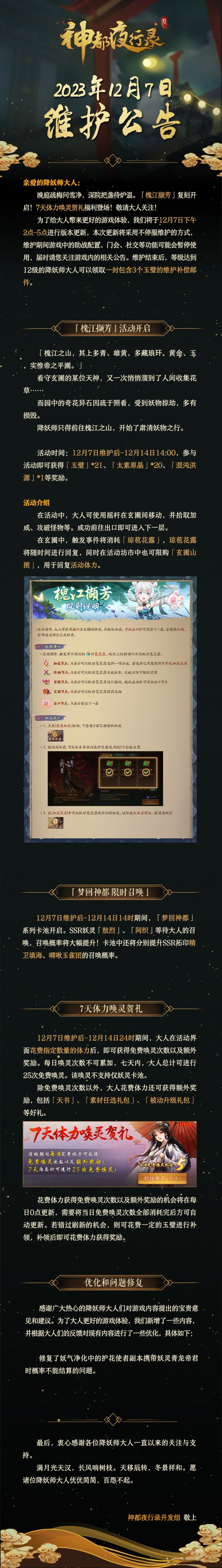 为了给大人带来更好的游戏体验,我们将于12月7日下午2点-5点进行版本更新,本次更新将采用不停服维护的方式,维护期间游戏中的助战配置、门会、社交等功能可能会暂停使用,届时请您关注游戏内的相关公告。维护结束后,等级达到12级的降妖师大人可以领取一封包含3个玉璧的维护补偿邮件。