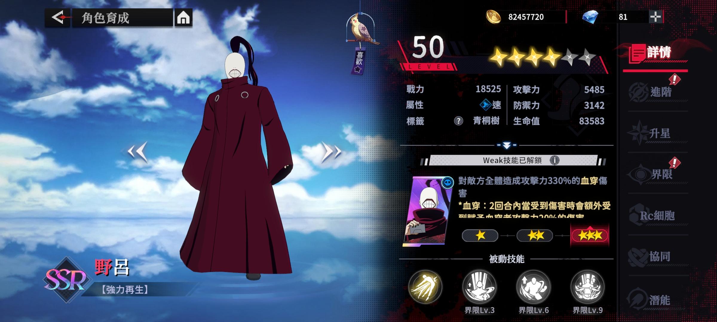 死亡印记:使用主动技能后,敌方目标受到自己最大生命值12%的伤害,伤害量不超过施加者攻击力的250%,也就是说铃屋什造攻击力越高死亡印记的伤害也就越高,既能对群无限斩杀,又能对单打出不俗的输出,这点已经超越了大部分的SSR了