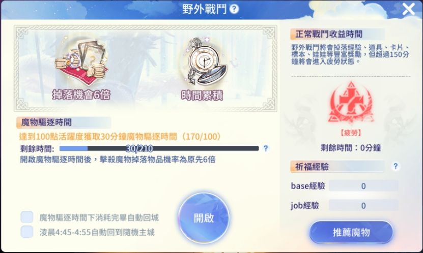 每天记得把时间都用完,推荐找一个技能就能清掉且经验又不错的怪来挂机,那如果同时他的掉落物又是你想要的,那就更棒了。