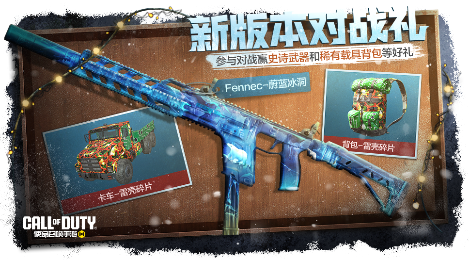 新版本来袭,战士们当然要在对局中体验一下喽~12月8日,新版本对战礼正式上线,战士们参与游戏对局即可获得史诗级武器:Fennec-蔚蓝冰洞、以及卡车-雷壳碎片、背包-雷壳碎片、粘性手雷-雷壳碎片等精美好礼。