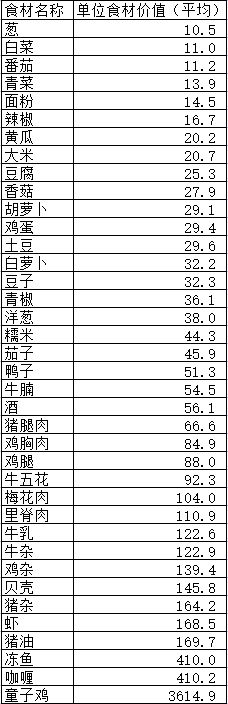 单位食材价值表