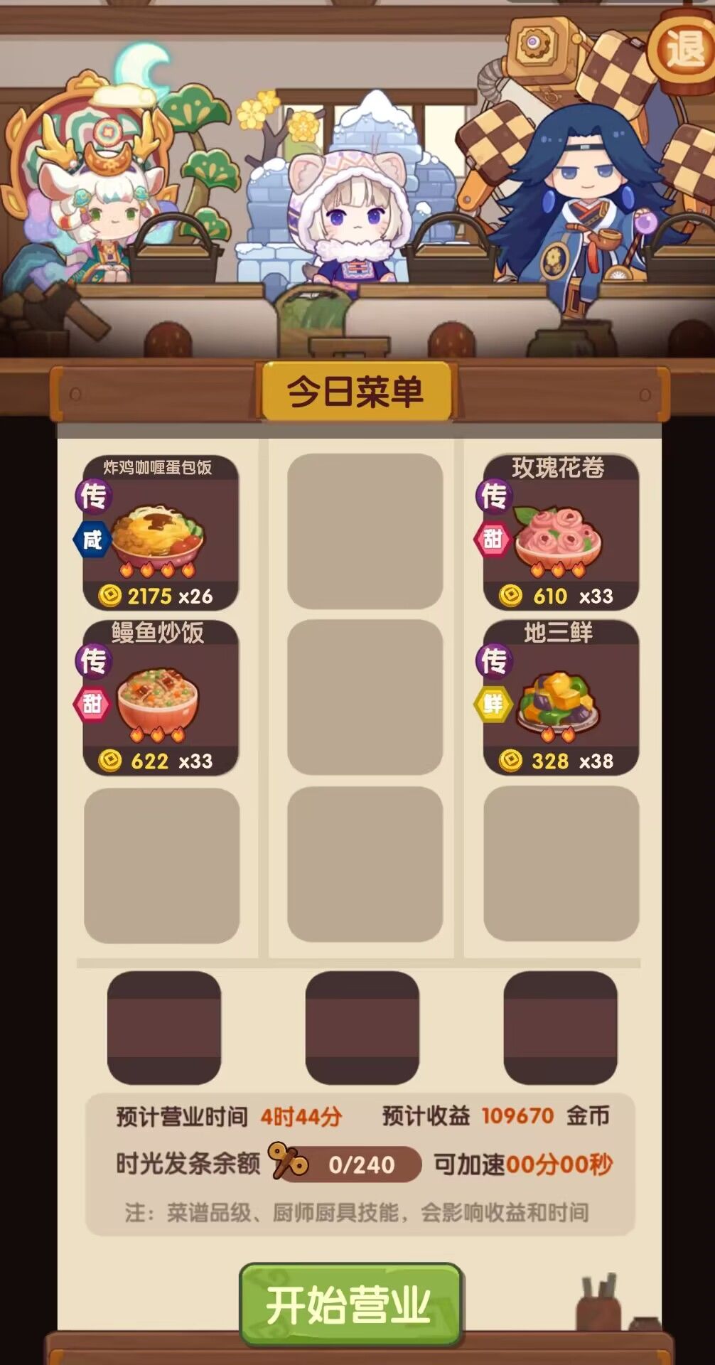 ③对于有刺客队但是菜谱不全的玩家:可以考虑提高一下补冰雪和江南烟雨池的优先级(x)可以用双刺客加一个能做神传的做饭搭子,兼顾效率和爆率;