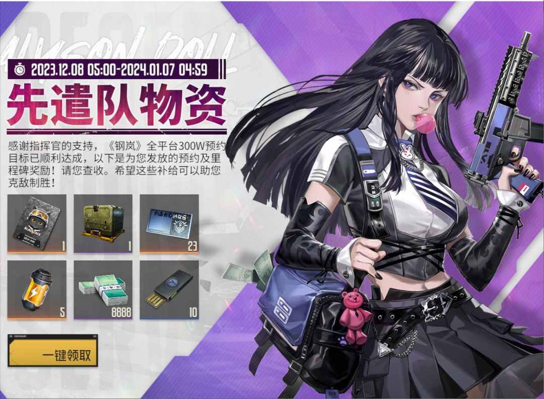 活动内容:指挥官登录游戏即可在【活动中心】→【先遣队物资】领取预约及里程碑奖励。