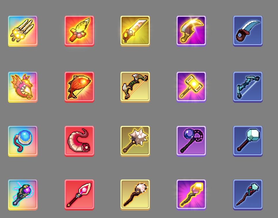 今天偷偷跑去美术大哥工位看到了一大波武器的图标,小刀、弓箭、法杖等等