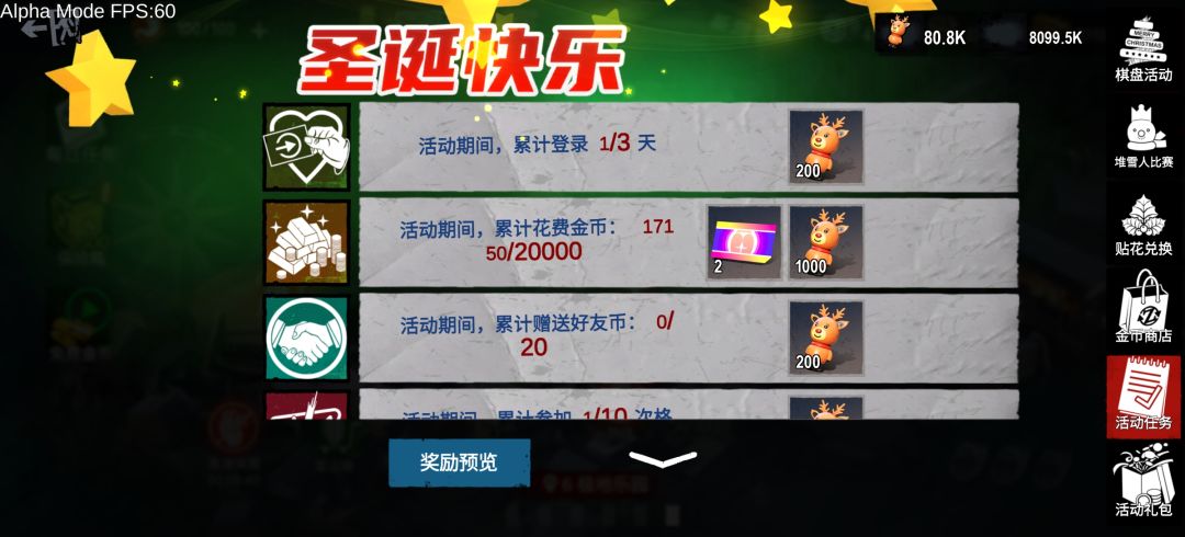 完成节日活动任务,可获得一定量圣诞棋子和专属时装莎莉兑换券,包括累计登录、花费金币、送好友币、格斗次数、消耗体力和开启盲盒任务。