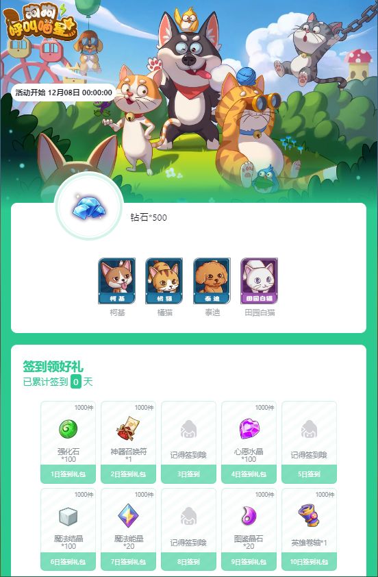 签到同时可参与集卡活动,集齐「柯基」、「泰迪」、「橘猫」、「田园白猫」卡片即可兑换500钻石!