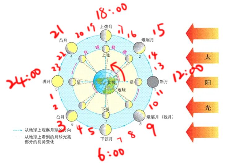 月相是月球的明与暗,而月升月落时间则来自地球的明与暗——