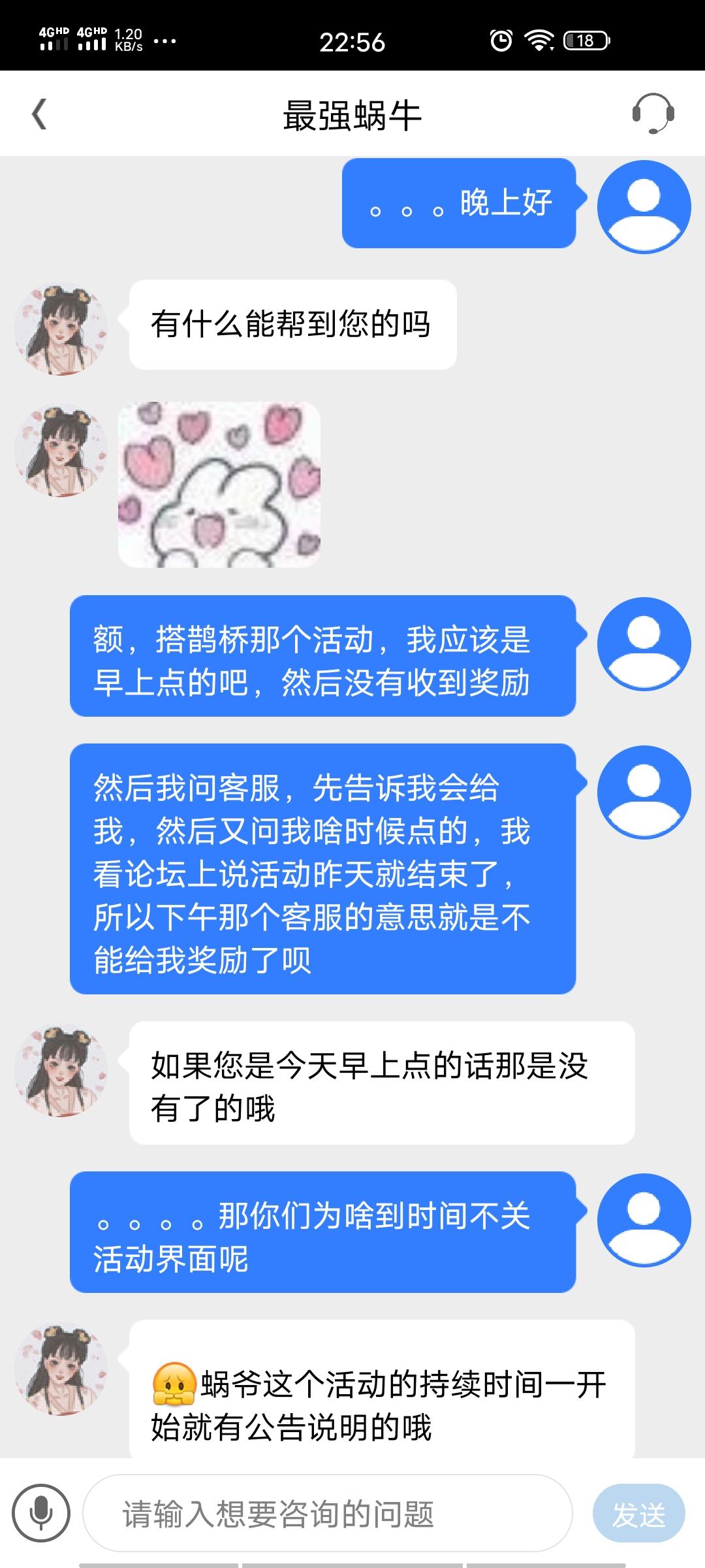 忍一步越想越气,我没有关注鹊桥活动的截止时间,今天早上点到百分百了,然后没有邮件,我就跑去问客服,客服说会给我。然后我就期待着。