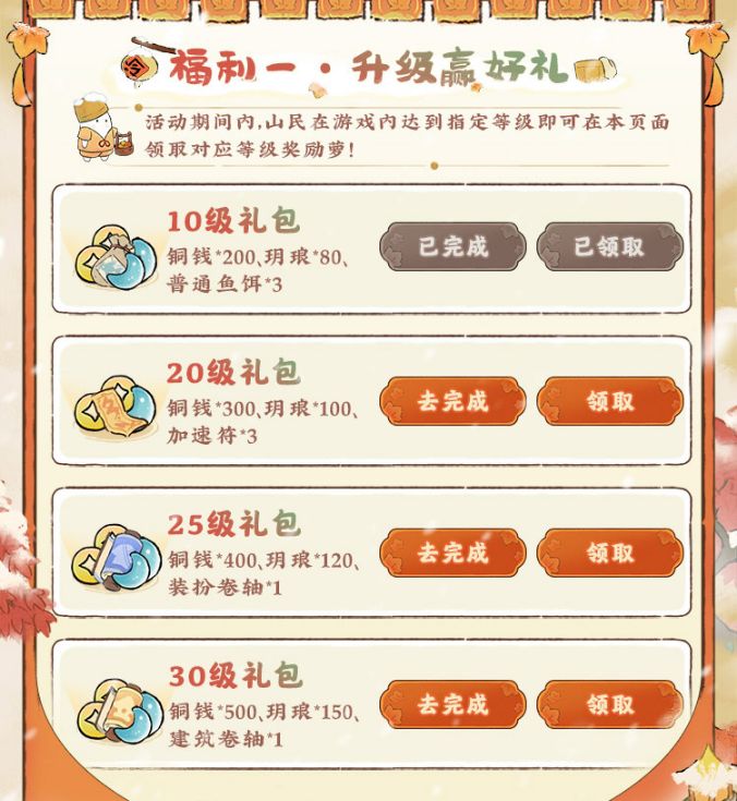 活动期间,山民在游戏内达到指定等级后,即可在本页面领取对应等级奖励萝,内含铜钱、玥琅、加速符、装扮、建筑卷轴等游戏道具,参与简单奖励丰厚,大家不妨趁此机会,在这个冬天好好提升一波自己的等级吧~