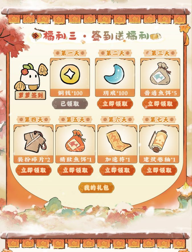 如果仅仅只有升级福利,萝们可不会同意。签到福利闪亮登场!累计签到7天就能获得包含装扮碎片、建筑卷轴在内的海量游戏道具,动动手指即可轻松获取,山民们快来驻足停留,欣赏萝萝山这动人的美景萝~