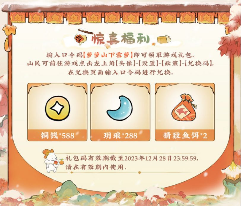 想不到吧,萝们竟然还留下了一个惊喜福利的小彩蛋~前往游戏点击左上角【头像】-【设置】-【政策】-【兑换码】,输入口令码【萝萝山下雪萝】,即可领取游戏礼包,内含铜钱、玥琅、精致鱼饵等游戏道具~