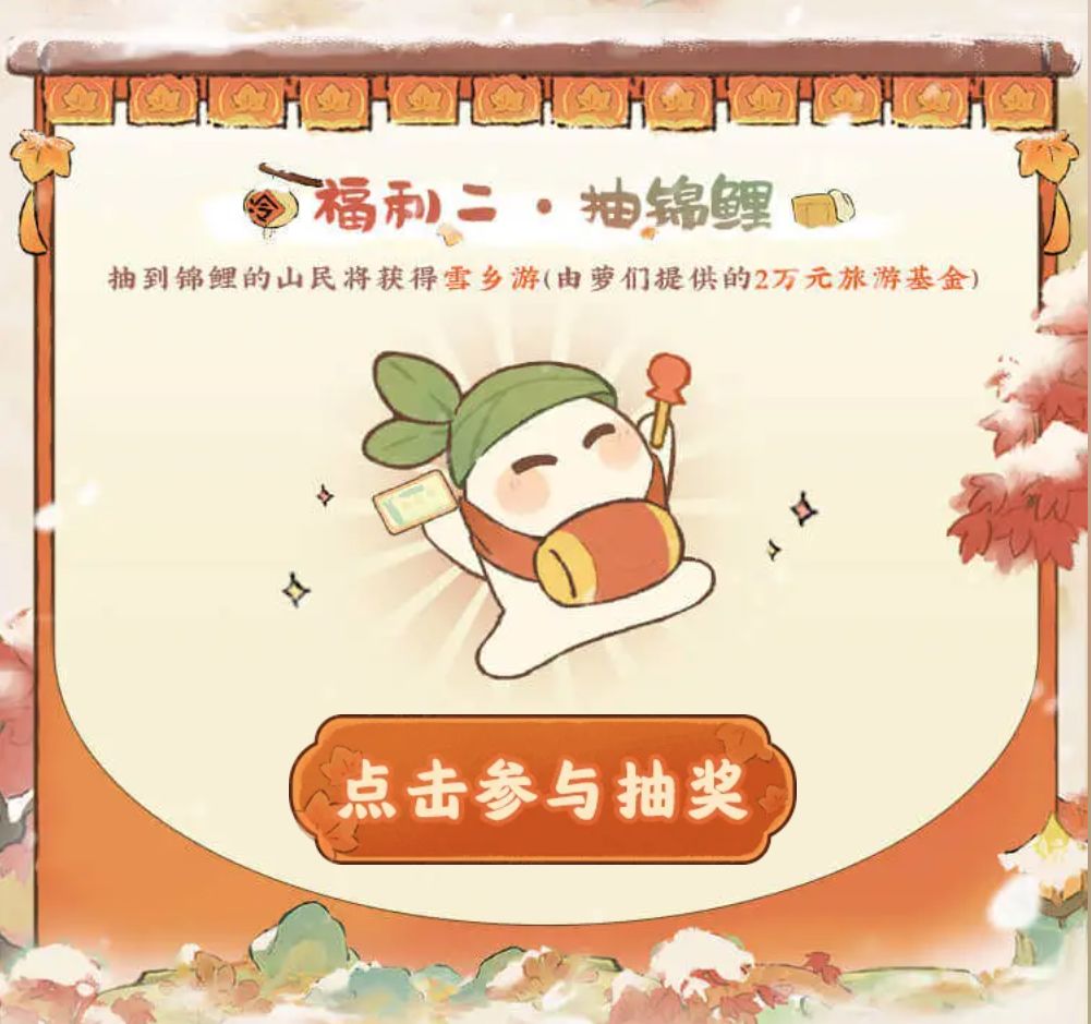 快来烟火桃源乡拜访那里的山民,和他们一起玩耍吧,银装素裹的萝萝山期待与各位山民的相遇!还有,千万不要忘了参与活动萝,说不定赢取2万元雪乡出游基金的锦鲤萝就是你~