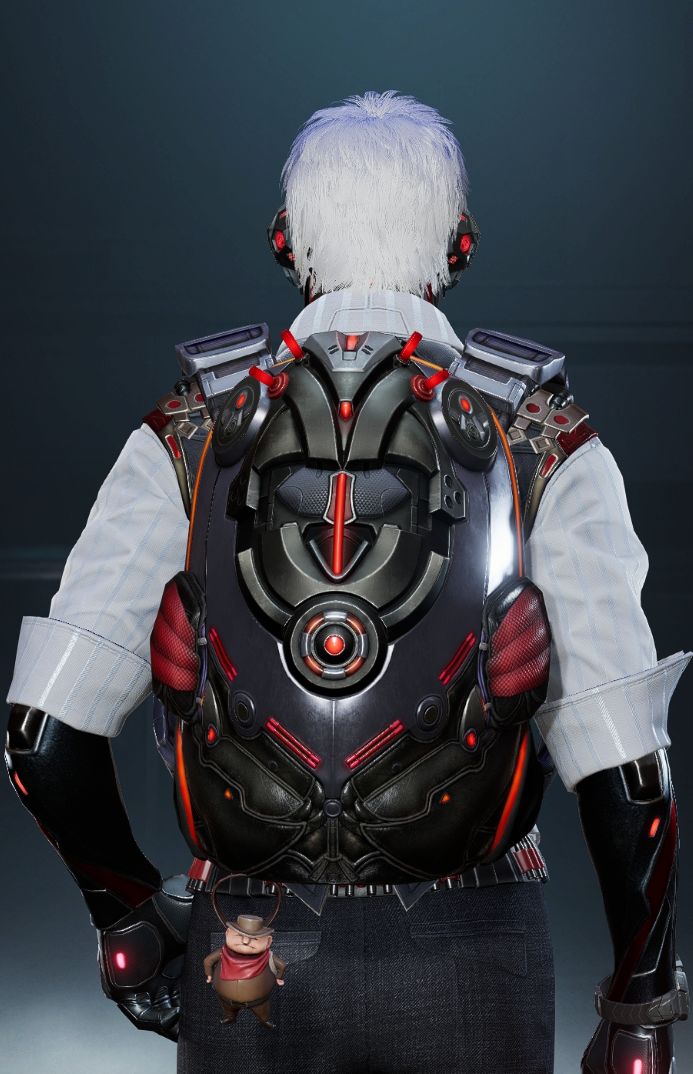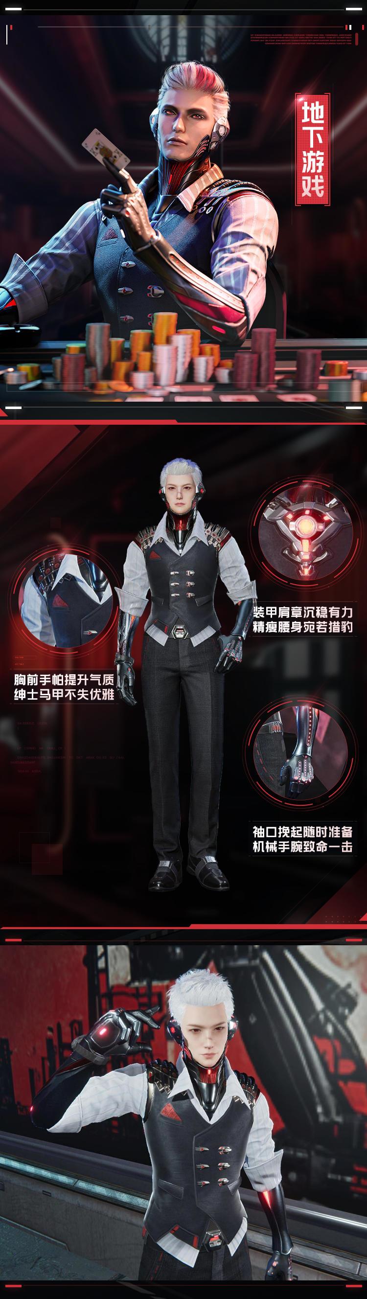 两套【地下游戏】都安装上了具有科技感的暗黑装甲,血色的红光象征着地下四伏的危机。男款时装为改良西服,绅士的外表下却是通体重甲,仿佛隐藏着什么不为人知的过往;女款时装则为新中式设计,优雅又不失干练,红龙刺绣寓意地位,就像是能掌控整个地下的老板。