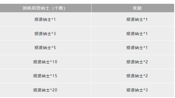 活动期间,累计消耗一定数值的「招贤纳士」将可以获得对应数量的「招贤纳士」。