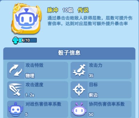作为新晋的高级传说骰子,脉冲的技能为通过暴击击败敌人获得层数,层数可提升伤害倍率,达到200.500.1000层时会额外提升暴击率,所以我们在脉冲骰子的搭配上我们可以选择太阳和光祁,这二者都有暴击率加成,而脉冲骰子暴击率越早变高的话就能更快的叠加层数。
