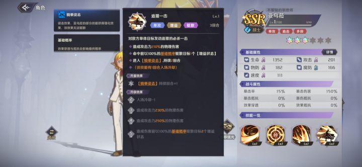 1、亚乌拉大招五星骑乘状态3回合,冷却两回合,基本保证一直骑着,所以专武的主要作用就是用这个技能去输出和打驱散。