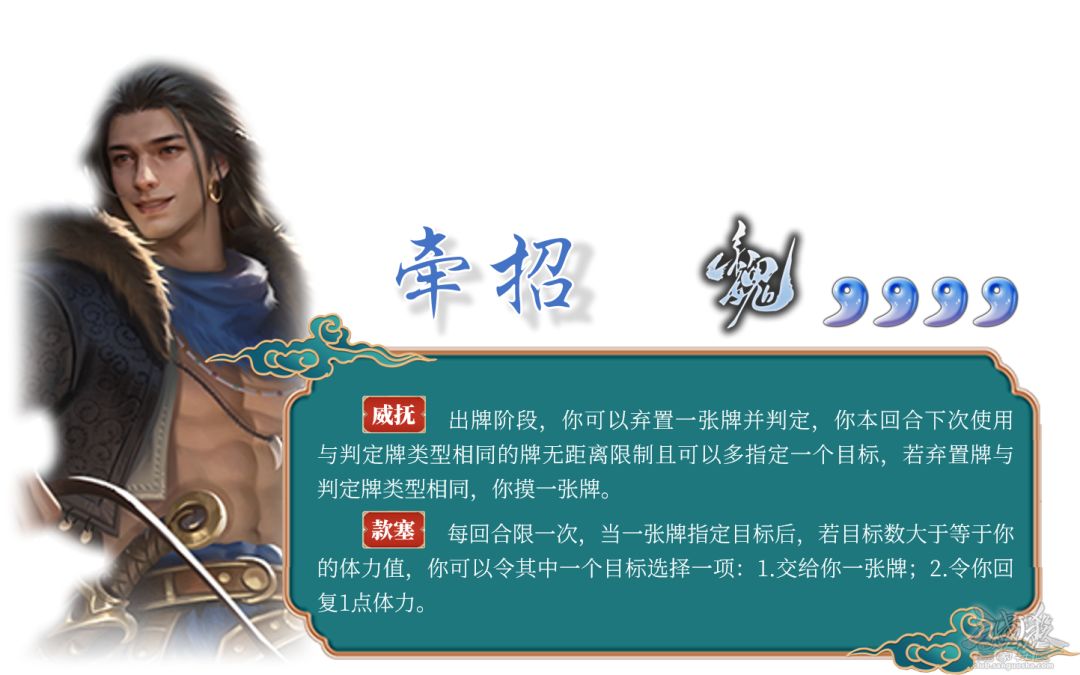 牵招首发价格为同心结45,还可以在夺宝活动抽取或10个传世玉玺兑换。这个武将的上下限方差较大,操作起来有一定难度,玩不好很容易把牵招玩成一个四血白板,新手玩家谨慎选用。