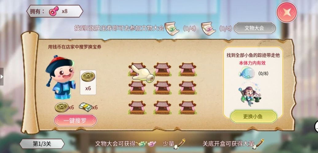 使用钱币在店家中搜罗足够的换宝券即可前往参加文物大会。