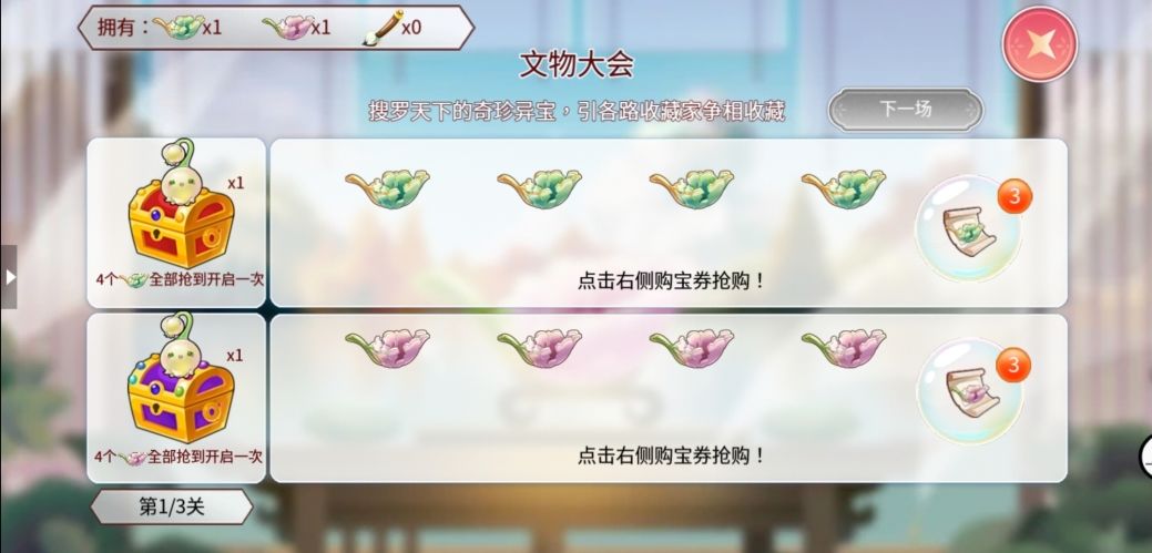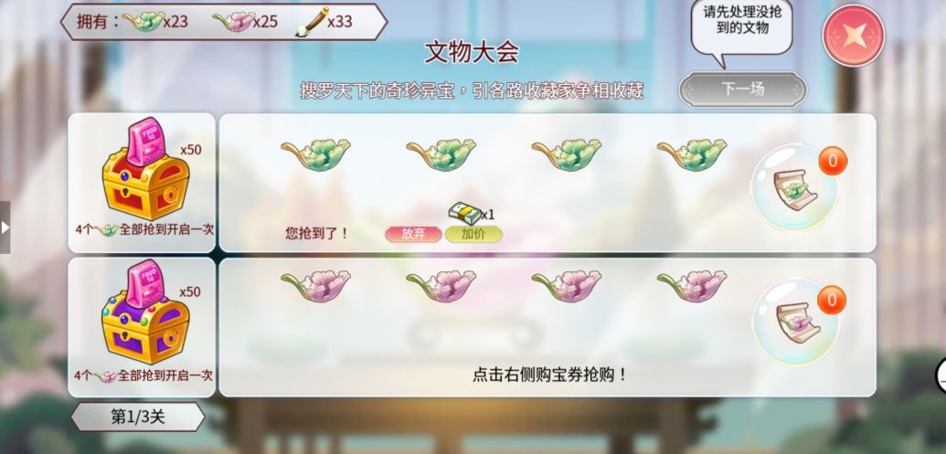 来到文物大会后,点击右侧购宝券搜罗天下的奇珍异宝,和各路收藏家争相收藏。