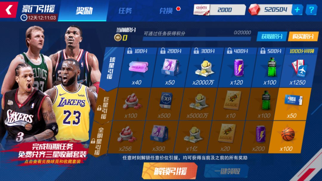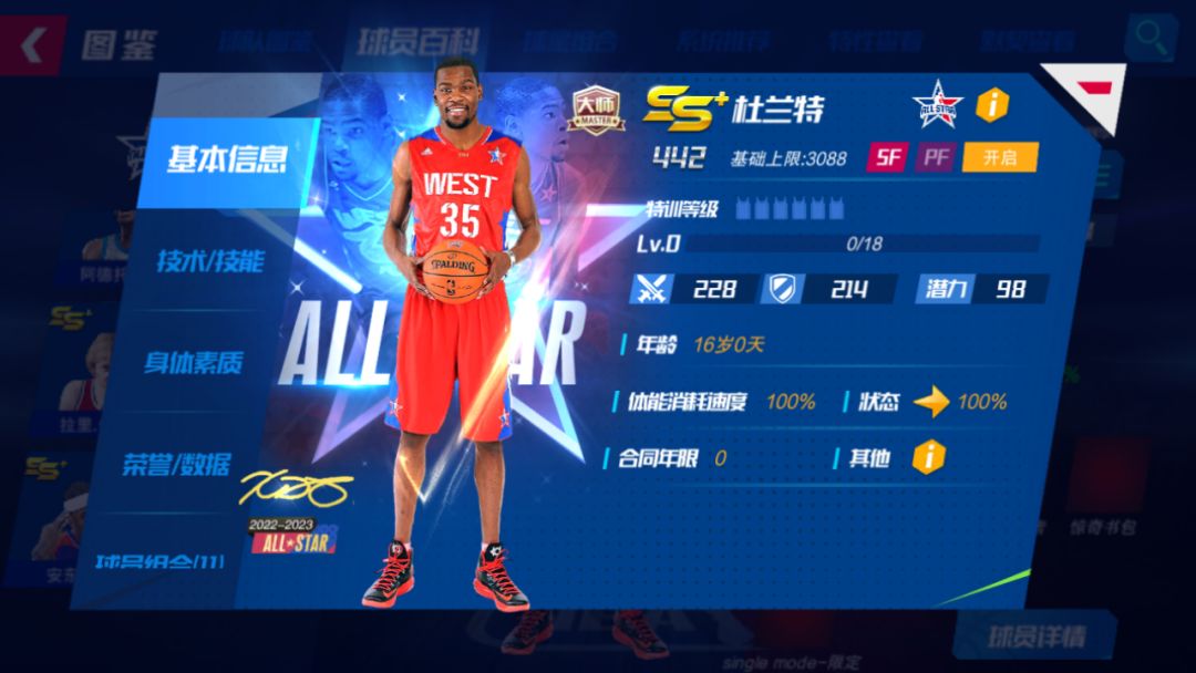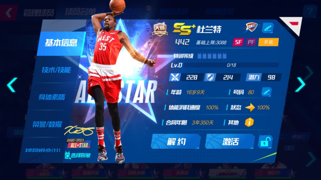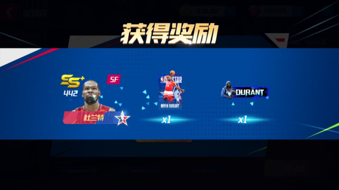 每次“抽一次”,则随机解锁一个奖励格,获取奖励格中的“全明星球员”或“转会费”。至多抽取12次,成功将全明星队杜兰特签约入队!