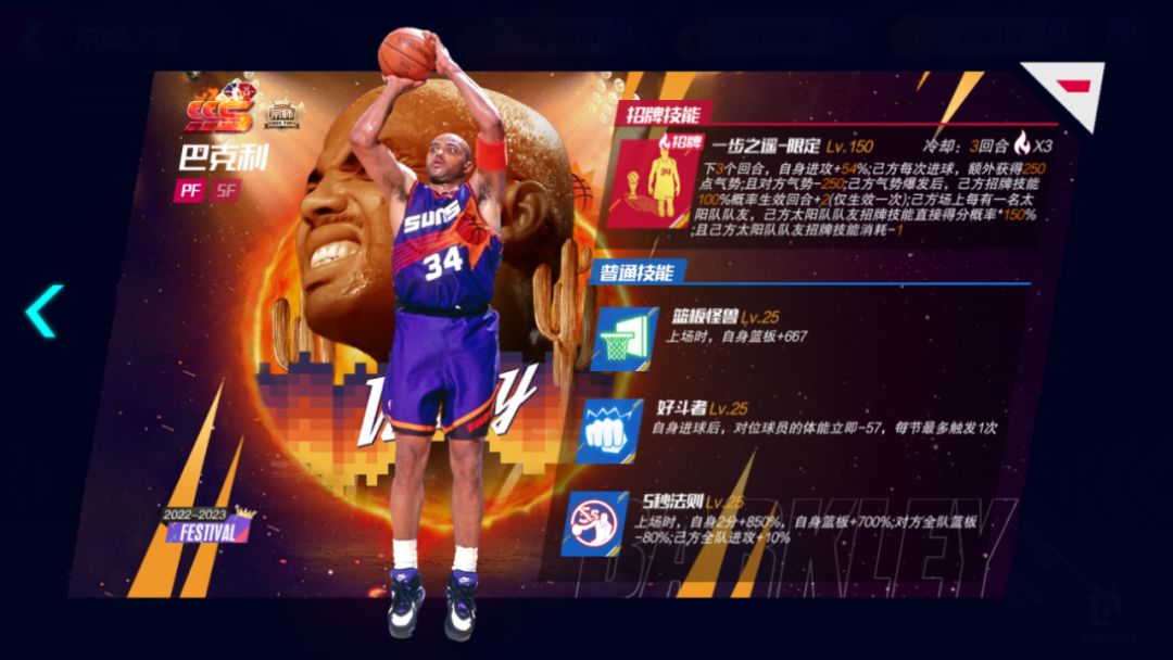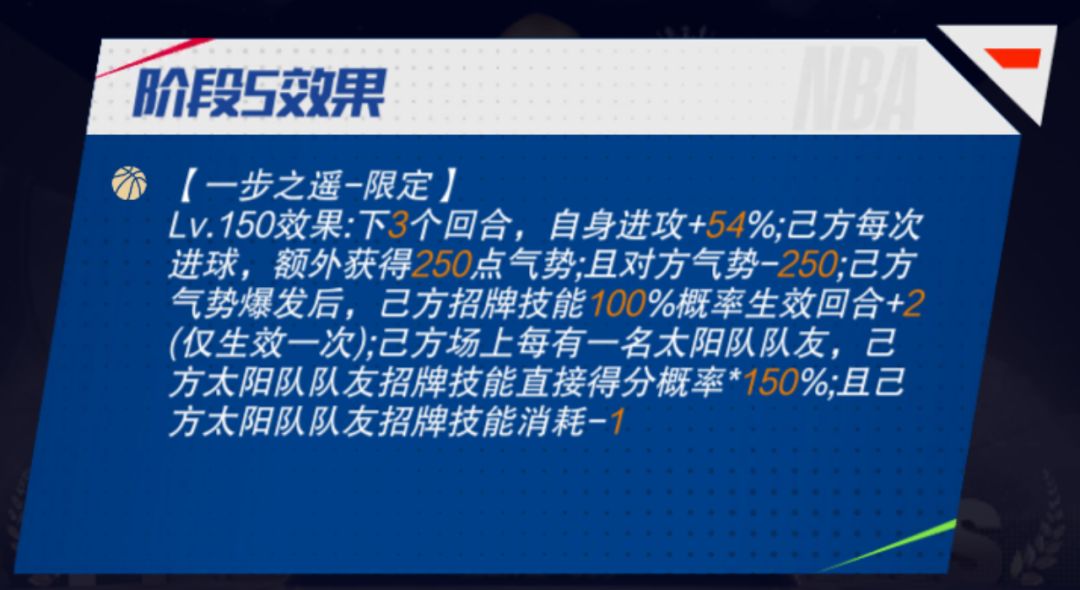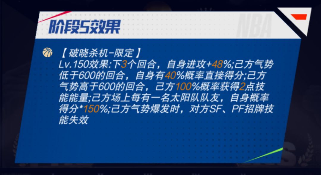 破晓杀机-限定:下X个回合,自身进攻+X%;己方气势低于600的回合,自身有X%概率直接得分;己方气势高于600的回合,己方X%概率获得Y点技能能量;己方场上每有一名太阳队队友,自身概率得分*X%;己方气势爆发时,对方SF、PF招牌技能失效。(预计在上线同时开启迈向巅峰)