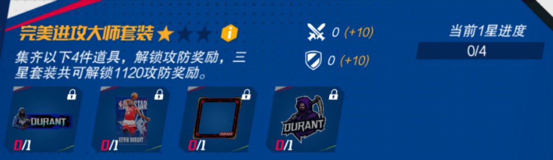 集齐以下4件道具,最高可解锁1120攻防奖励。(本次活动暂且开放“完美进攻大师”一星套装,敬请期待后续活动开放二三星套装!)