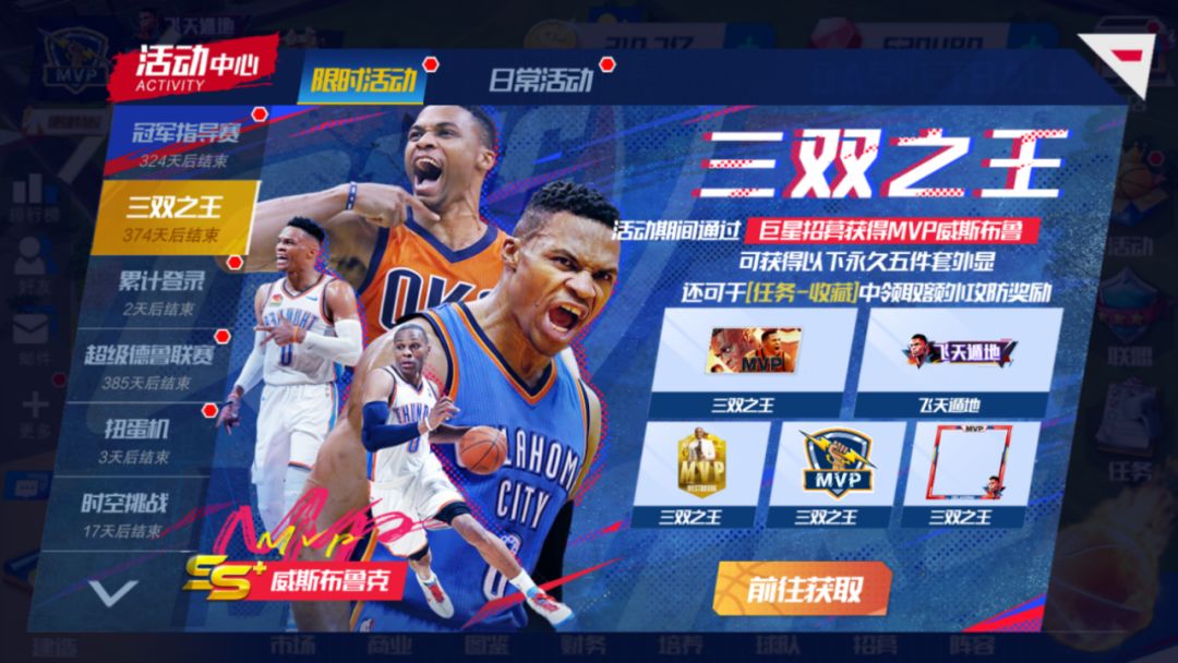 活动期间通过巨星招募获得MVP限定SS+威斯布鲁克,可领取“三双之王”永久外显五件套(称号、头像、头像框、背景板和专属球员形象)。