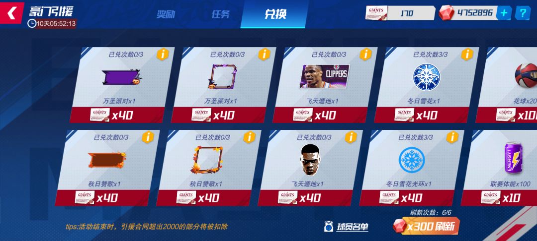 至多抽取250次,成功将MVP威斯布鲁克签约入队!130抽必出SS+限定球员,每30抽必出大师球员!抽中MVP威斯布鲁克即可领取五件套外显!(称号、头像、头像框、背景板和专属球员形象)