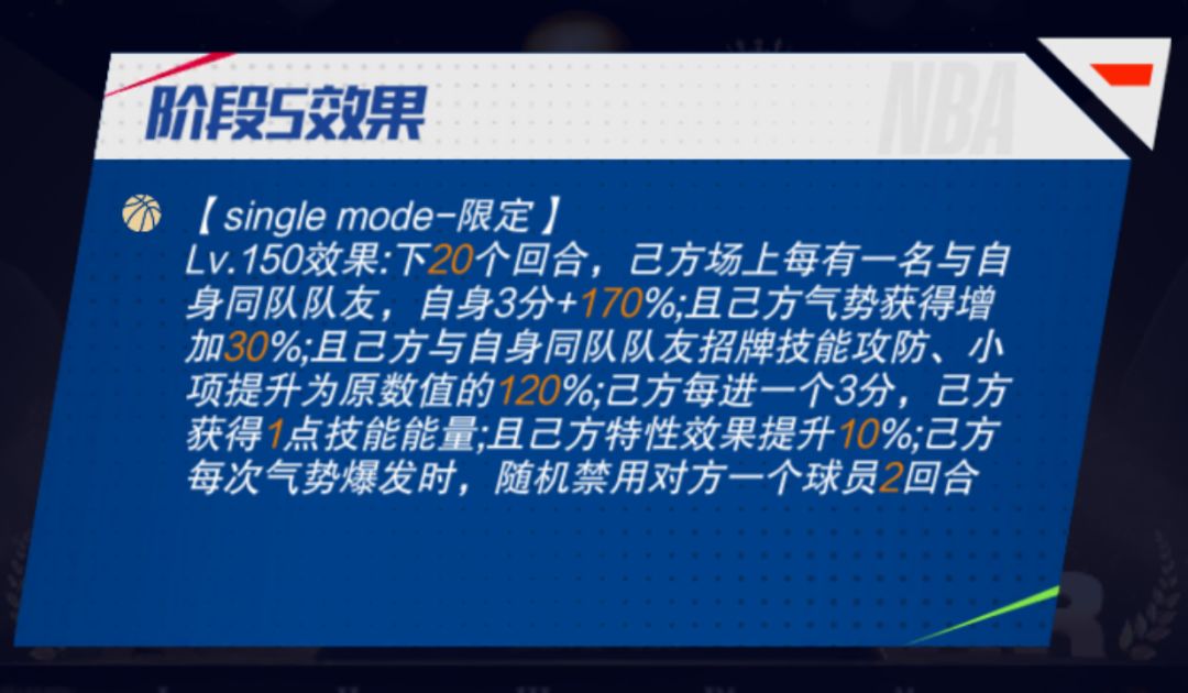 single mode:下X个回合,己方场上每有一名与自身同队队友,自身3分+X%;且己方气势获得增加X%;且己方与自身同队队友招牌技能攻防、小项提升为原数值的X%;己方每进一个3分,己方获得Y点技能能量且己方特性效果提升X%;己方每次气势爆发时,随机禁用对方一个球员Y回合。(预计在上线同时开启迈向巅峰)