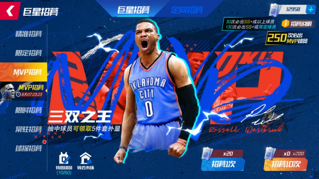 双十二MVP代言人威少强势返场!活动期间,可使用【点券】在【MVP招募-三双之王】池中,招募MVP威斯布鲁克。