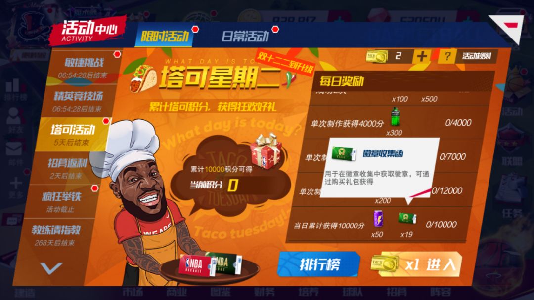 当双十二撞上星期二,超级升级塔可星期二!经理人们又可以和詹姆斯一起制作美味又健康的塔可,赢取丰富奖励!(新增徽章收集函和巨星招募函,徽章收集函可用于徽章收集卡池抽取徽章!累计10000、20000、35000积分都可解锁一张巨星招募函,50000积分可解锁两张巨星招募函!累计10000、14000、20000积分都可解锁19张徽章收集函!)