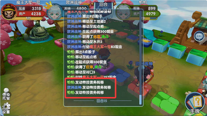 债务转移。付钱(只有自己付钱会发动)就有机会发动(包括升级房子,买地,换房子(?),医药费,交税,等。角色技能付钱比如张昭踩她,董白猜卡,步练师治疗(可以),张松送卡等;糜竺收利息。)丢弃(丢掉不会给到任何人,但卞夫人能不能捡到?)任何类型卡(武器和行动卡都能扔还是比较强的)指定角色(组队就是可以让队友也可以让另外一个对手甚至可以选择支付对象。于是可以玩点花的。比如自己给队友付钱糜竺标记王元姬✓)“给你”理解为选择对象先给自己一半自己要付的钱,然后自己再全款付出去钱✓(因为技能联动付钱会影响拿卡)。不给钱角色是否会少出钱(张飞,孙鲁育✓)备注3资产小于该金额不发动。那就是现金不够卖地还是能发动了。