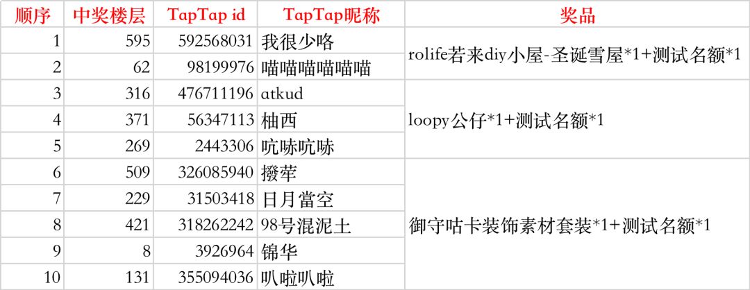具体中奖名单将会在12月12日10:00公布,届时请中奖的玩家留意taptap站内信,并按照指示填写用于登录游戏的手机号码,居居将会统一登记中奖小蜗的手机号码,12月21日10:00游戏开放下载后使用填写的手机号码即可成功登录游戏;如果错过了下载时间,也可以加入官方玩家交流群(q群:823323859)私戳客服小姐姐获取游戏包噢~~