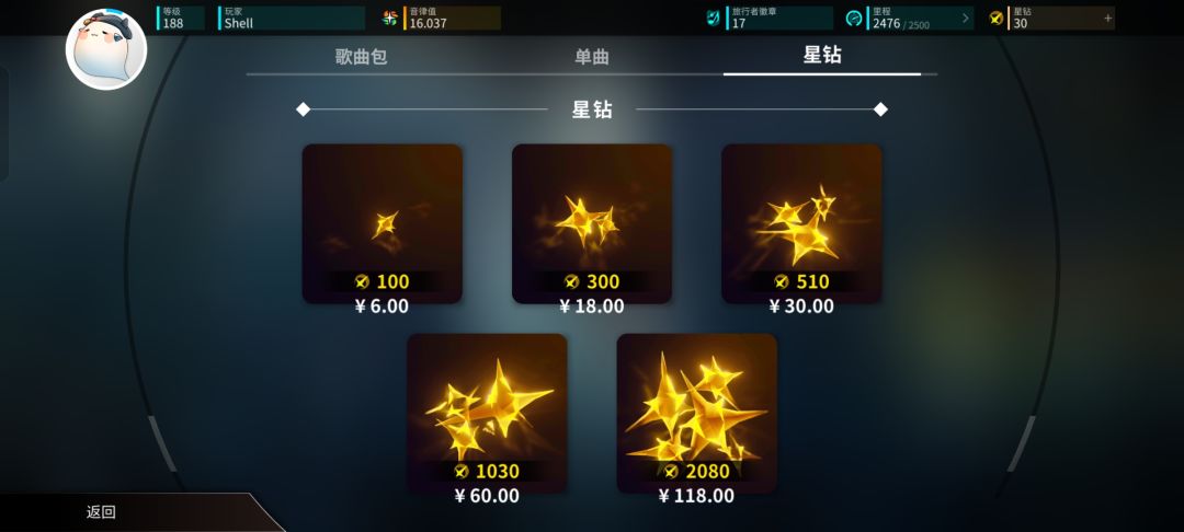 在游戏内购买曲包,单曲和部分驾驶员需要充值星钻,游戏提供了五个档次,如图所示: