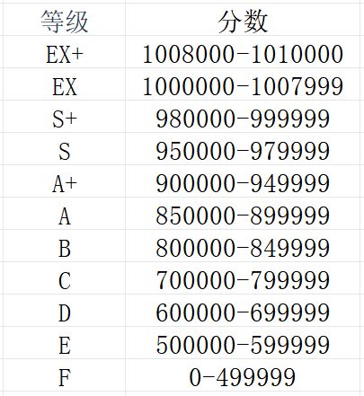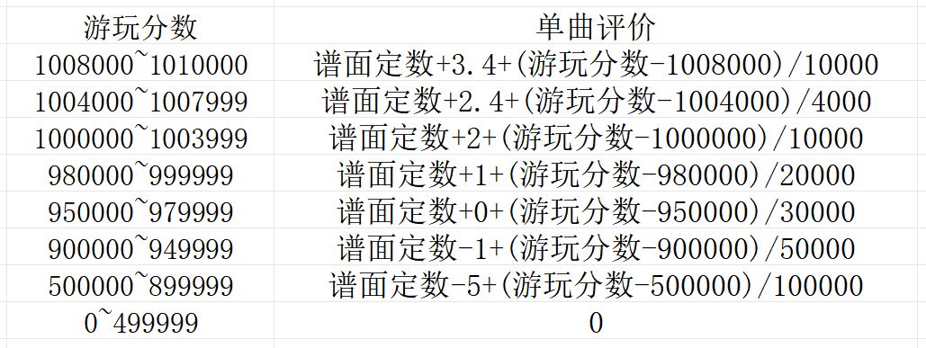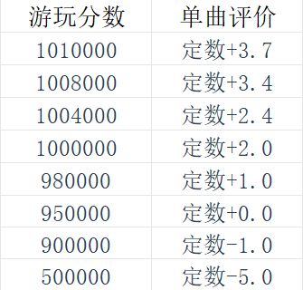 需要注意的是,当游玩分数为理论值时,会在原评价基础上增加0.1,也就是说1009970和1010000虽然只差了30分,大概2-3个Perfect+,但实际上对Rating影响巨大。