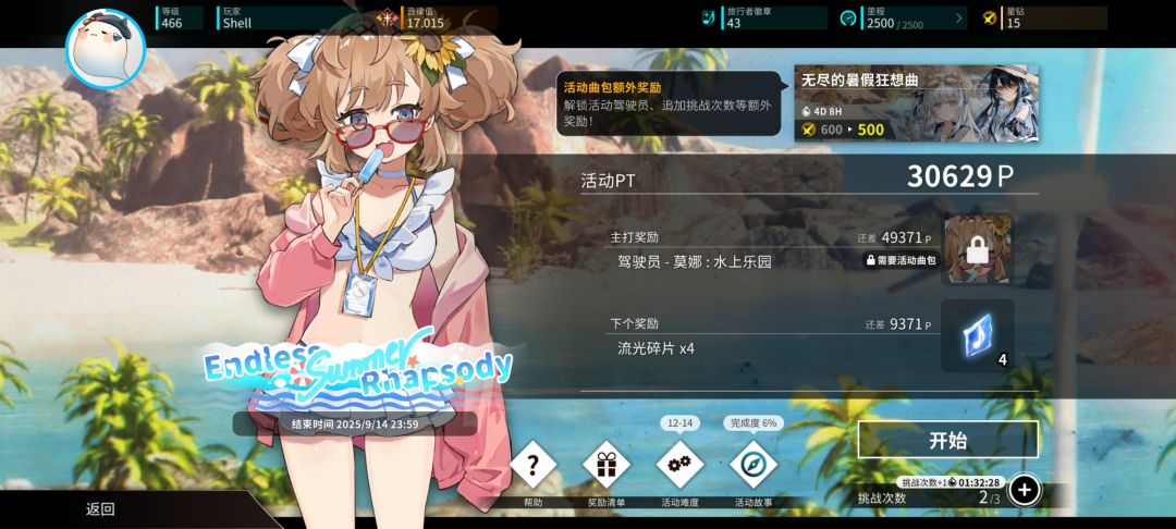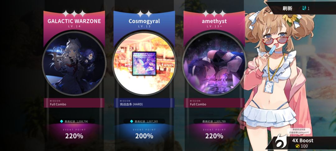 点击开始以选择乐曲,如果对乐曲不满意,可以使用旅行者徽章刷新乐曲,如果想尽快获得奖励,可以使用星钻获得600%的PT奖励,完成挑战会根据倍率获得对应的PT奖励,可以在界面查看本次取得的PT和下一档奖励需要的PT差距。