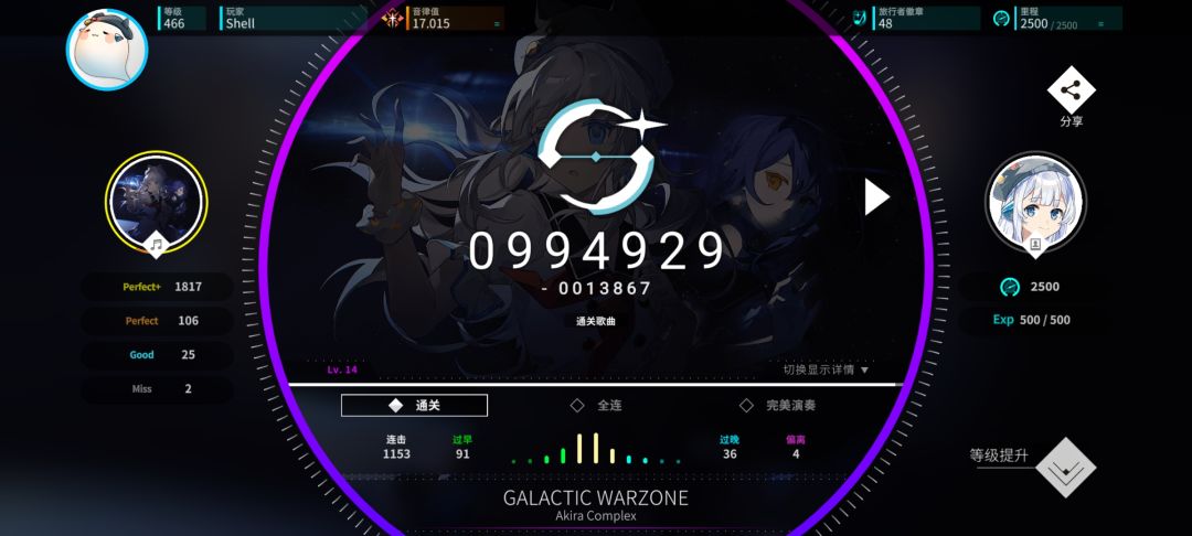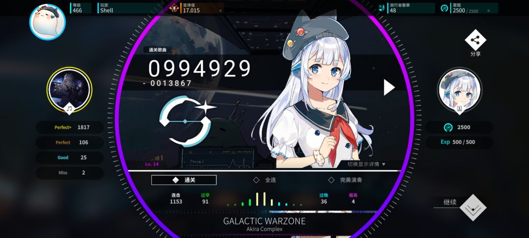 在结算页面,玩家可以查看本局游戏获得的分数,评级,Rating变更和详细判定,当点击右边的驾驶员头像时,可切换展示模式,点击左边的曲绘则可以换回来。