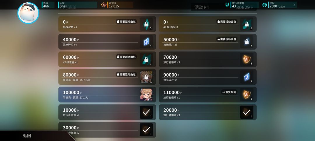 奖励清单可以查看活动可以获得的奖励,其中需要购买曲包才能获得的奖励会附带标识。
