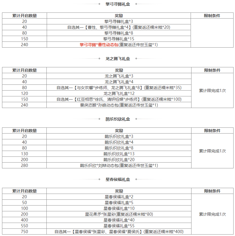 活动礼盒打开后,部分重复道具返还糯米糍/夺宝重置券,具体详情见礼盒概率。