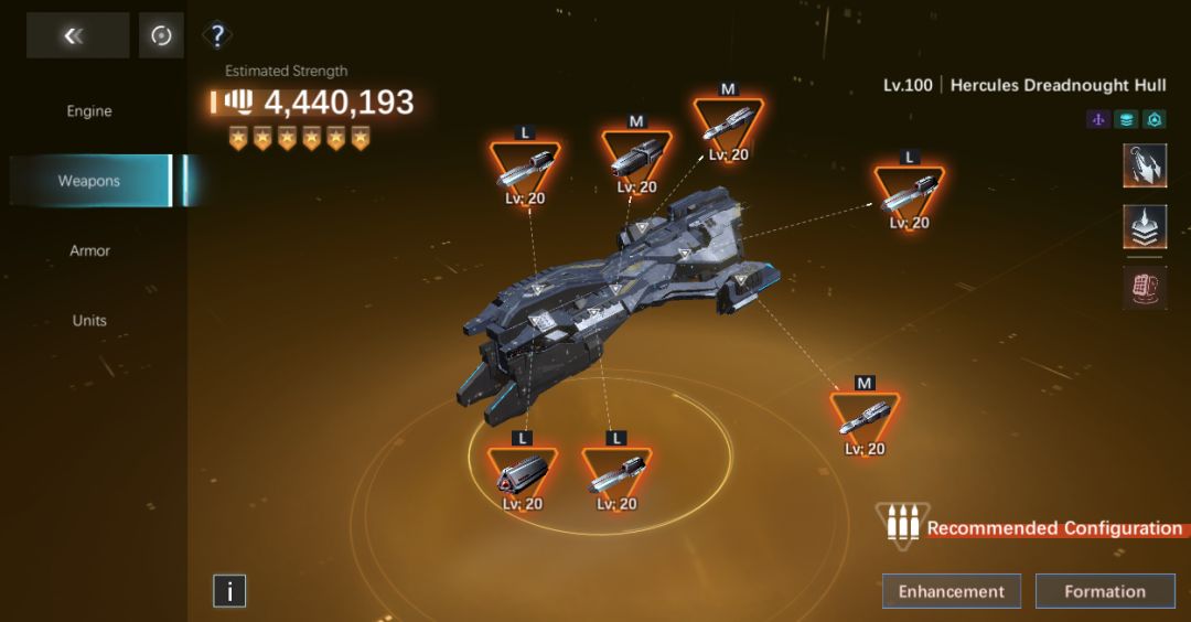 i. 在参考配置界面,你也能够查看该舰船在舰队阵型中的推荐位置,包括装备参考配置部件之后的预估战力和数值