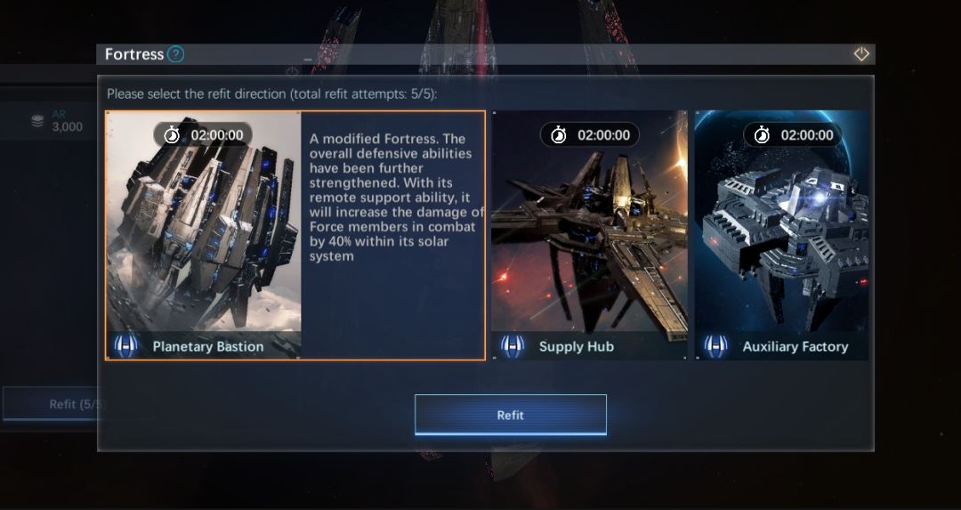 1. 行星堡垒----着重加强了整体防御能力。可通过远程支援使其所在星系内所有阵营成员舰队战斗时造成的伤害增加40%