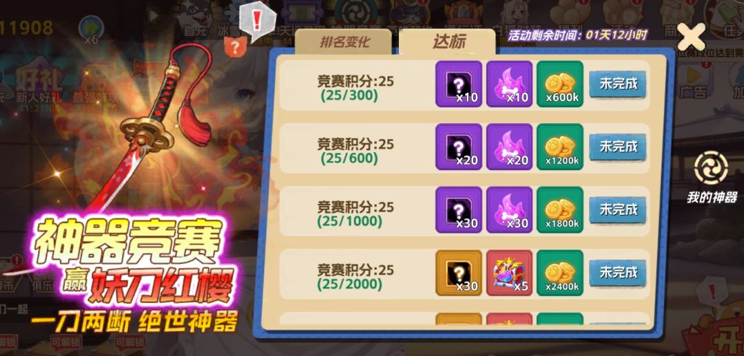 开服6-7天【神器竞赛】,比拼神器的收集和养成,可以获得神话神器-妖刀之红樱,游戏中出现的第一把红神器,可以大幅增加属性,大佬必备的一把。但只有活动第一名才有,小白玩家可以不用追。同期开放的活动【天运寻宝】很划算,可以参与一下,不氪金可以白嫖大量资源,付几十块就可以获得大量高品神器和材料,性价比推荐。